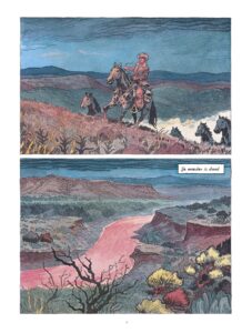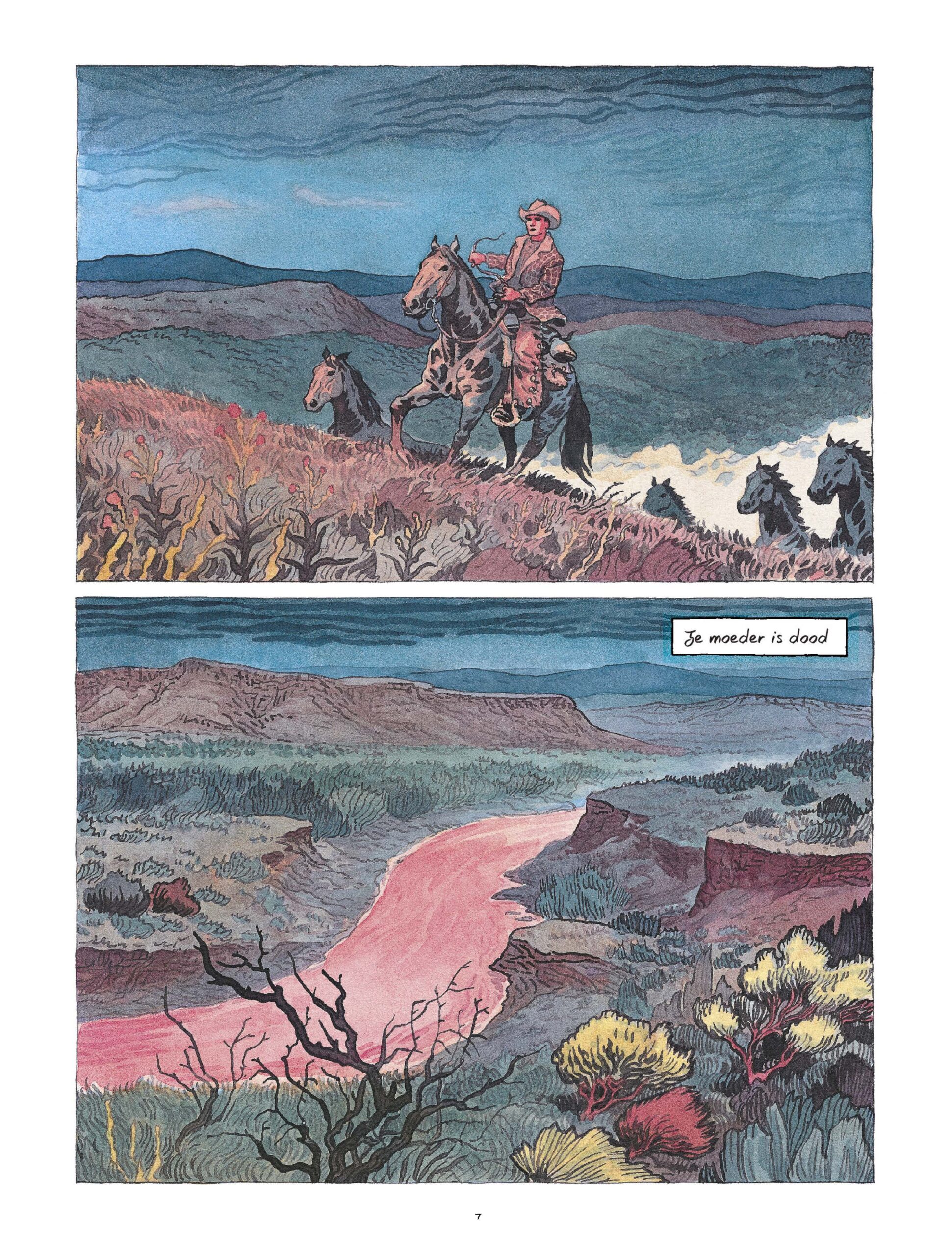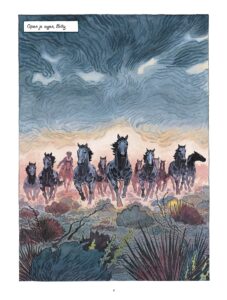 Visueel is Billy Lavigne wel ronduit indrukwekkend. Pastor tekent in losse, nerveuze lijnen en kleurt met aquarelverf. Maar wat vooral opvalt, is zijn gedurfde kleurgebruik. De overstap naar meerkleurig tekenen is hier een meesterzet. Dit is geen bruin-grijze western. Pastor kiest voor rokerig blauw, stoffig paars, roze luchten, okergeel zand. Luchten draaien als inkt in water. Paarden denderen in wolken van pigment. Het geeft het boek een dromerige, bijna hallucinante sfeer. Sommige platen doen zelfs denken aan het (post) impressionisme van Monet en van Gogh. Tegelijk blijft het overzichtelijk en helder. Elke plaat is met aandacht opgebouwd, met oog voor ritme en contrast.