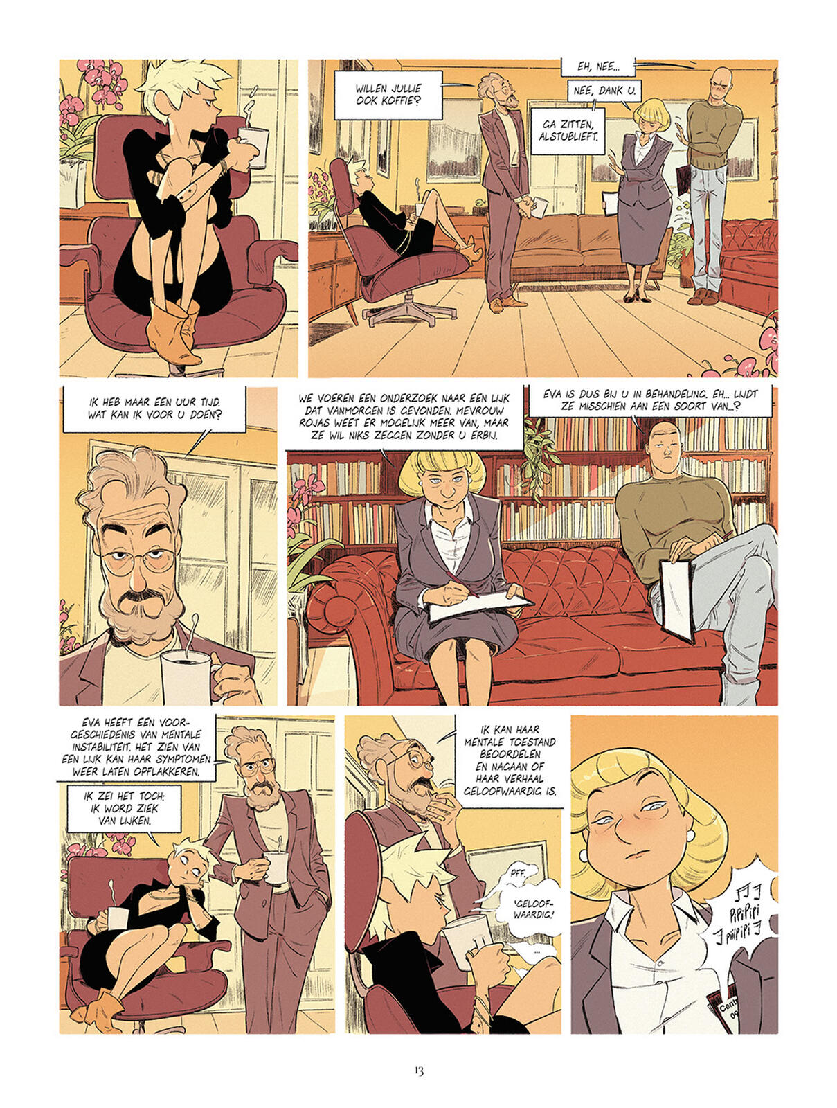 Toch is dit tweede deel niet zonder rafelranden. Lafebre laat Eva zó nadrukkelijk het verhaal sturen, met haar constante uitleg, reflecties en innerlijke stemmen, dat het beeld soms ondergesneeuwd raakt. Het voelt bij vlagen alsof Lafebre liever alles via Eva’s tekst vertelt dan via zijn beelden. Daarnaast is er de structuur. Voor wie houdt van overzichtelijke plots is dit boek wellicht een beproeving. Eva’s versie van de waarheid is grillig, met flashbacks, zijpaadjes en psychologische omwegen die je als lezer dwingen om constant bij de les te blijven. Dat kan vermoeiend zijn, zeker als je op zoek bent naar een klassieke misdaadstructuur met oorzaak-gevolg-ontknoping.