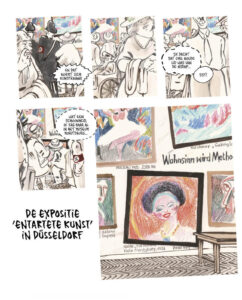 Dat perspectief blijft overeind, pagina na pagina. We volgen handen die het werk ophangen, verplaatsen en inpakken. We zien blikken die blijven haken of vluchtig passeren. Verzamelaars, museumbezoekers en functionarissen benaderen het schilderij ieder op hun eigen manier, steeds beladen met verwachtingen, angst of eigenbelang.